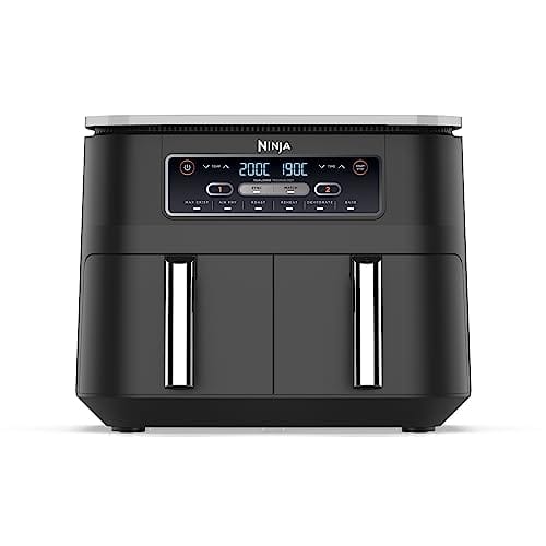 INCLUS: Ninja Foodi Air Fryer Numérique Double Zone (Prise UE), 2 tiroirs antiadhésifs de 3,8L allant au lave-vaisselle (capacité totale de 7,6L) et plaques croustillantes. Guide de recettes créées par des chefs. Couleur: Noir